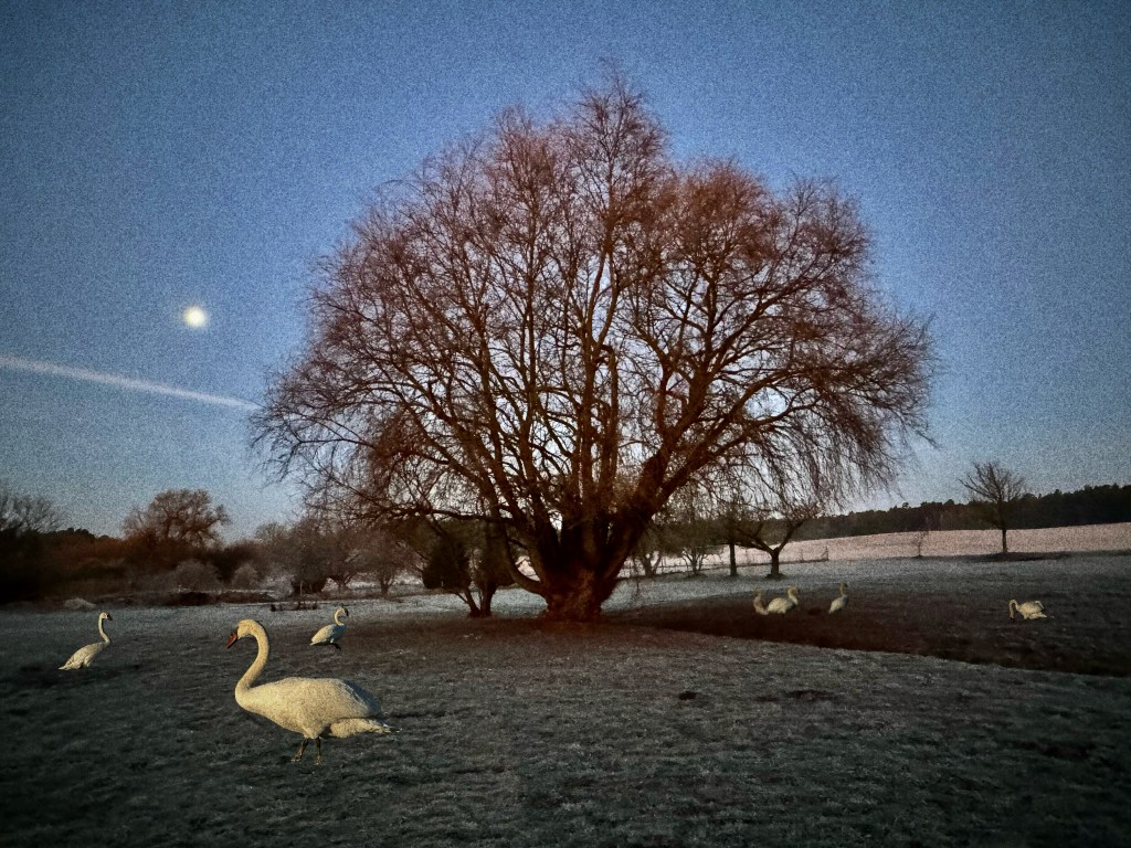 A group of swans stand motionless on a frosty meadow around a bare winter willow tree. The full moon hangs low in the bleached morning sky. The light is soft, almost weightless. The scene appears calm and harmonious—and yet something is not quite right. The swans were photographed in spring in an open field in Lusatia—far away from water, far away from where you would normally expect to find them. Their presence on dry land in such a large group is unusual, a subtle sign of ecological upheaval. The willow tree, photographed in the full moonlight near my hometown, adds another layer of subtle alienation. The collage combines these elements into a landscape that never existed – and yet could. Filters alter the photographic surface, giving it the appearance of a painting. In its beauty and composition, the image radiates tranquility, a suspended moment between familiarity and alienation, and a sign of a creeping process of change.