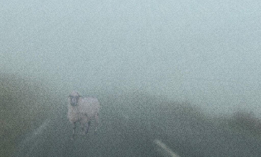 A sheep stands alone on a mist-covered road. The contours dissolve; only the faintest outlines of the world remain. The image evokes a sense of imminent danger. Was it taken through a car windscreen? Is this the moment before a sudden accident?