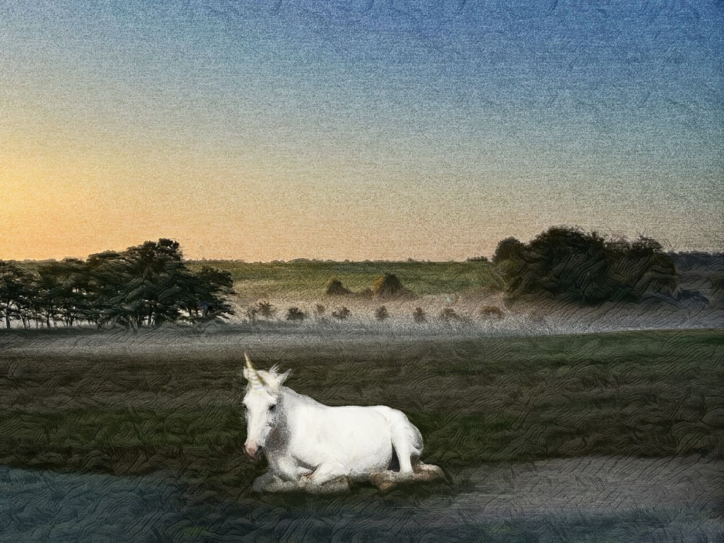 A unicorn lies in a wide meadow. The sun has not yet fully risen. Fog hangs over the landscape. The unicorn, symbol of purity and fantasy, lies calmly and somewhat exhausted in the middle. In its silence and unreality, it refers to a deep longing to make the impossible possible and to allow the wonderful to happen – even if only for a fleeting moment. The photo collage was created from two images, a landscape from my hometown and my neighbor’s horse. The unicorn’s horn comes from the animated series My Little Pony