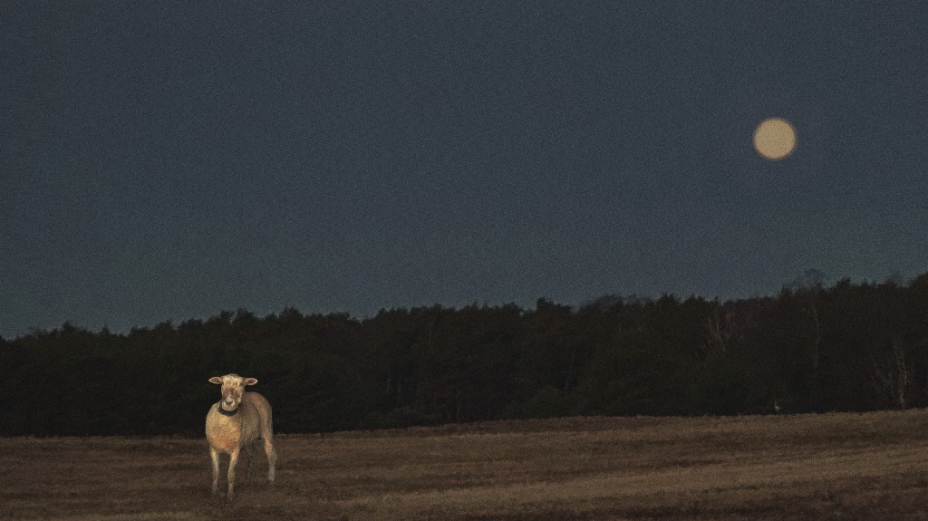 This work is based on the true story of a sheep named Wolfgang—the only one to survive a wolf attack. His throat was painstakingly sewn back together by his owner. In the background of the moonlit forest edge, barely visible, a wolf lurks. Wolfgang stands calmly, but the image is full of tension. His presence is unmistakable and symbolic – a figure between threat and survival. The image reflects a fragile moment in which the danger has passed but has not completely disappeared. The collage is constructed from superimposed photographic elements, all of which, except for the main motif, were photographed in the Heidehof_Golmberg nature reserve. Digital filters detach the image from photographic naturalism and give it a fictional, artificial quality. The uncertain quality reinforces the state of limbo and the threat.