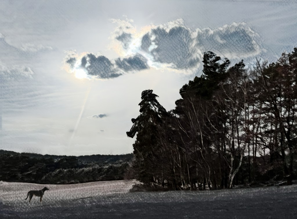 A lonely dog stands in a pale, wintry field. To the right, the forest stands dense and menacing, while broken sunlight breaks through the clouds in a fine beam. The landscape appears real, yet detached.