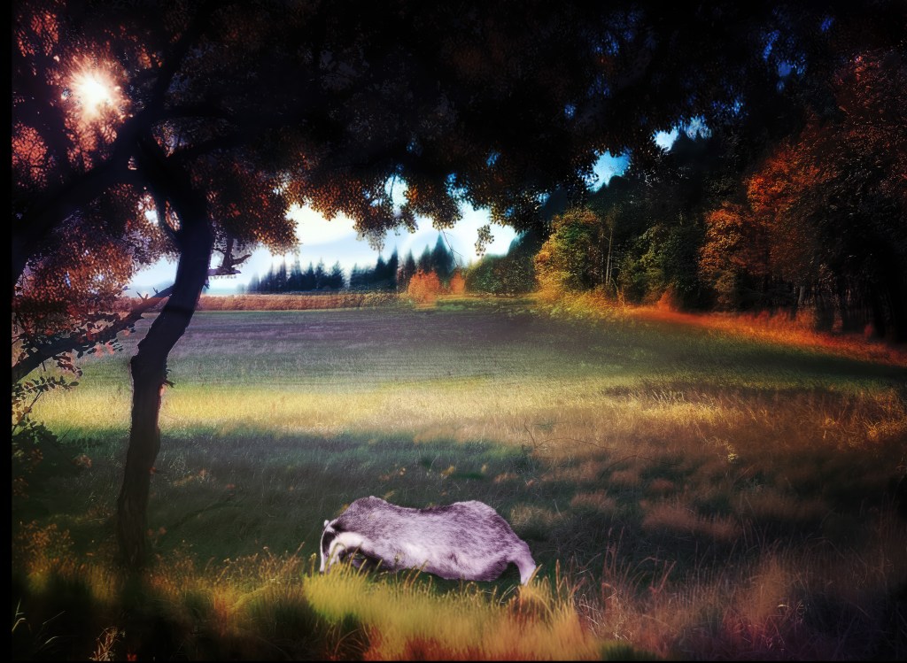 The badger was photographed after its death. The landscape has been altered by filters and painterly interventions. Through collage and composition, the badger is reinterpreted in an environment that has little to do with its normal behavior and habitat.