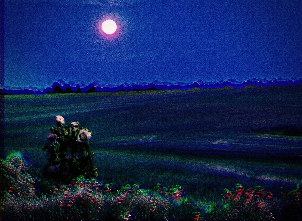 Bathed in an eerie lunar glow, the field stretches into the distance, its contours blurred by painterly filters and digitally altered tones. The colors shimmer with unnatural intensity – saturated blues, violets, and reds – evoking a dreamlike or even hallucinatory state.