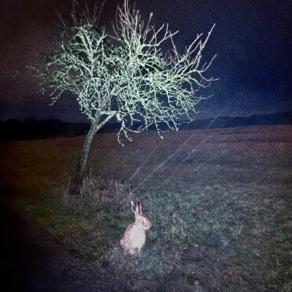 A hare sits in the grass under a bare tree, caught in the beam of an artificial light. Is it the headlights of an approaching car? The night is deep, the field wide and empty. But the hare does not flee. Its gaze is alert, unmasked—caught between wildness and stillness.