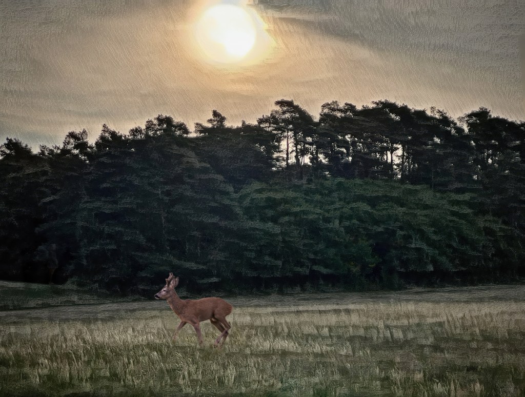 A young deer stands still on a meadow, its head slightly raised – as if it has sensed something. At first glance, the scene appears peaceful, bathed in quiet twilight. But a second look reveals an unsettling presence: glowing eyes gleam from the underbrush on the right – a hidden creature, a monster? On the left, a faint human-like figure emerges among the trees – barely visible, ghostlike.