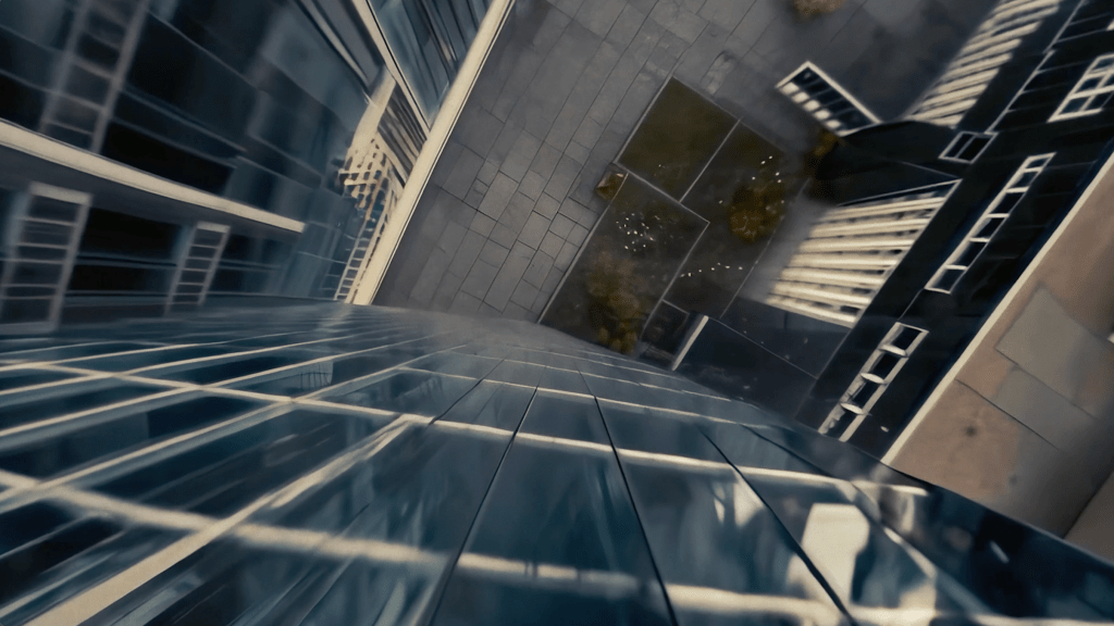 reality and subjective perception of time decouple. A woman appears to be falling over the edge of a building. Then the camera glides down the facade of a high-rise in super slow motion, as if it were her point of view. An endless fall, frozen in a perpetual loop. Reflections refract the space, stretching and distorting past and future. Finally, the perspective changes: we see a woman from behind, observing a female body in the act of falling. A frozen moment between observation and projection, between reality and reflection. The work plays with the paradox of time: a single instant becomes eternal, while the inevitability of the fall remains trapped in repetition. Past, present and future overlap: Time becomes the scene of a perpetual motion in a state of standstill. The viewers find themselves in a state between observation and immersion , as if they themselves were entering the stretching of time. The fall happens not only on the screen, but in the room, in the mind’s eye.
